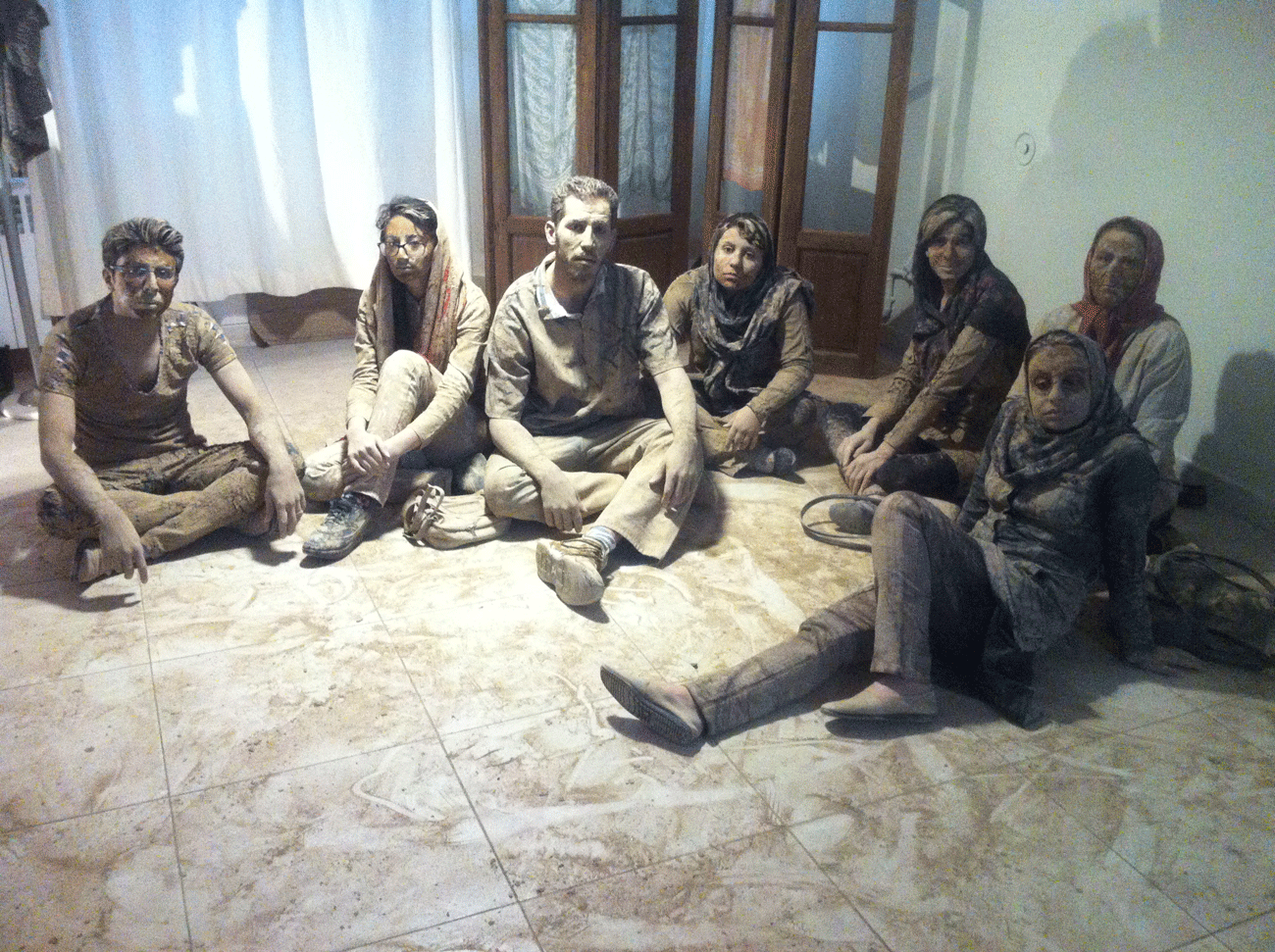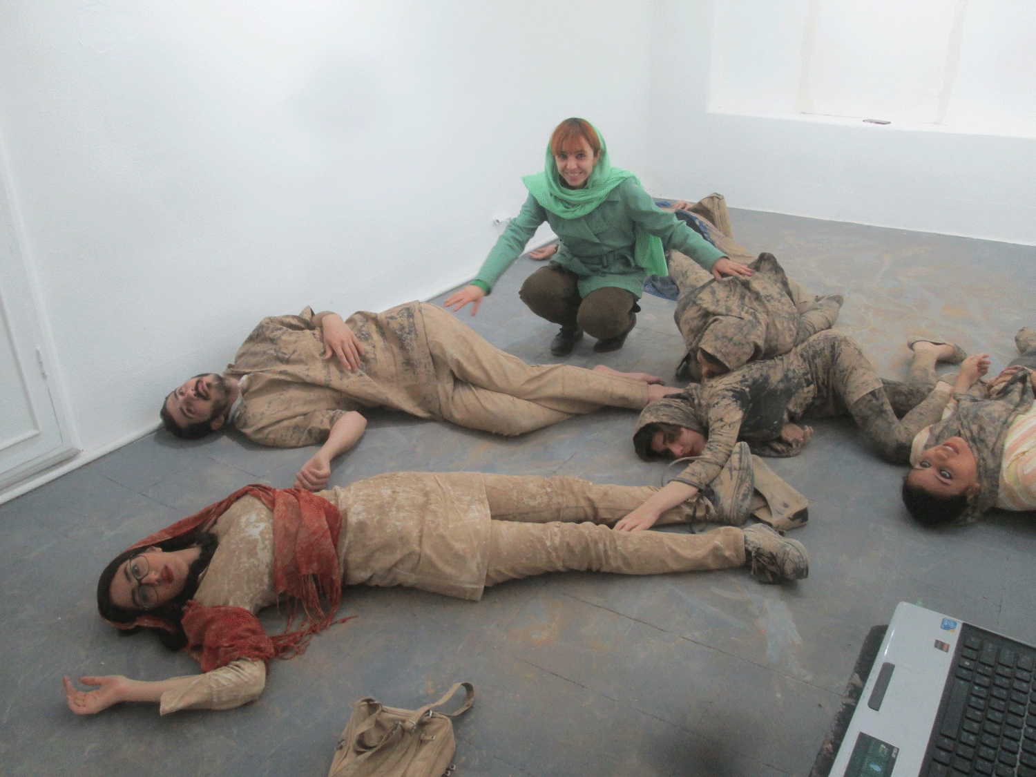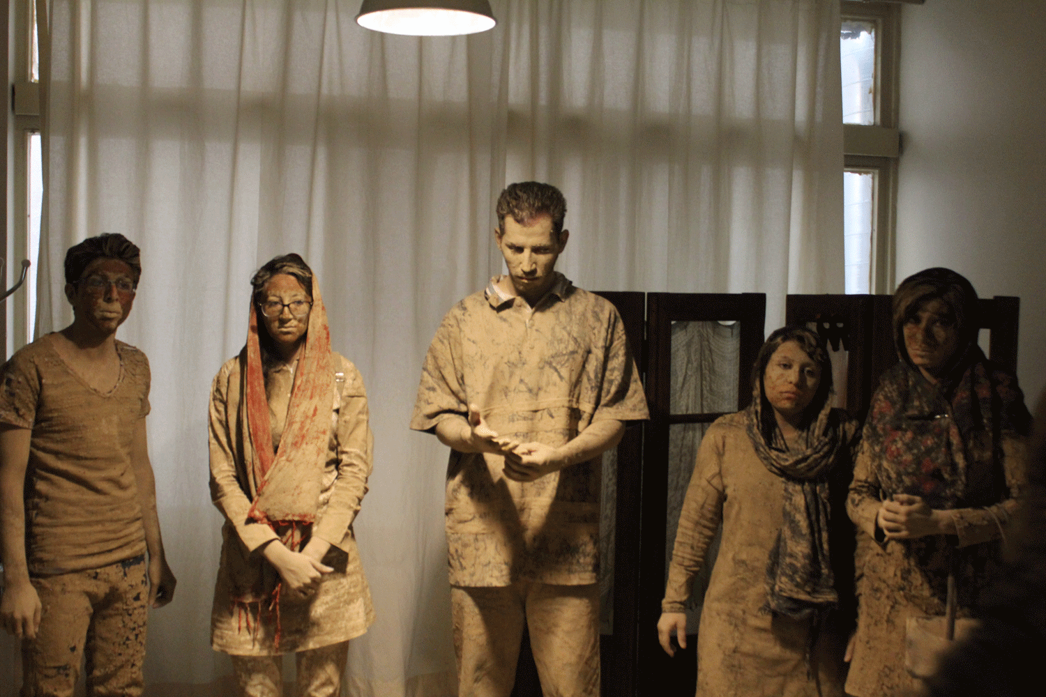 هفت نفر به تعداد هفت روز هفته همه گل اندود شده ( به نشانه ی آنکه اینها انقدر بی اعتنا و بی توجه بودند که سراسر وجودشان خاکی شده حتی قلب و روحشان هم از خاک است!) چیدمان شده اند و هر کس به شکلی درخواست کمک دارد اما توجهی به او نمی شود تا اینکه می میرد.