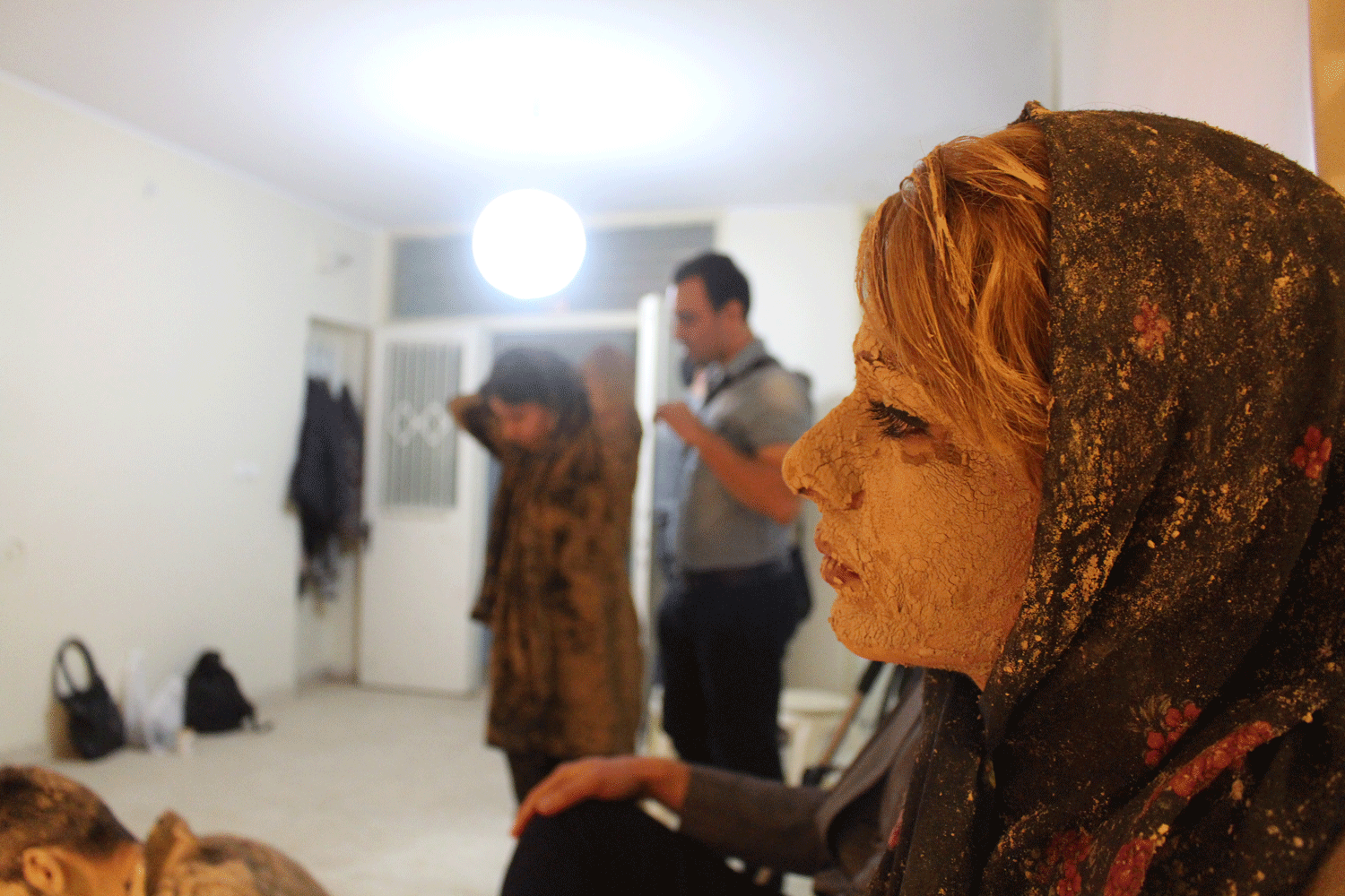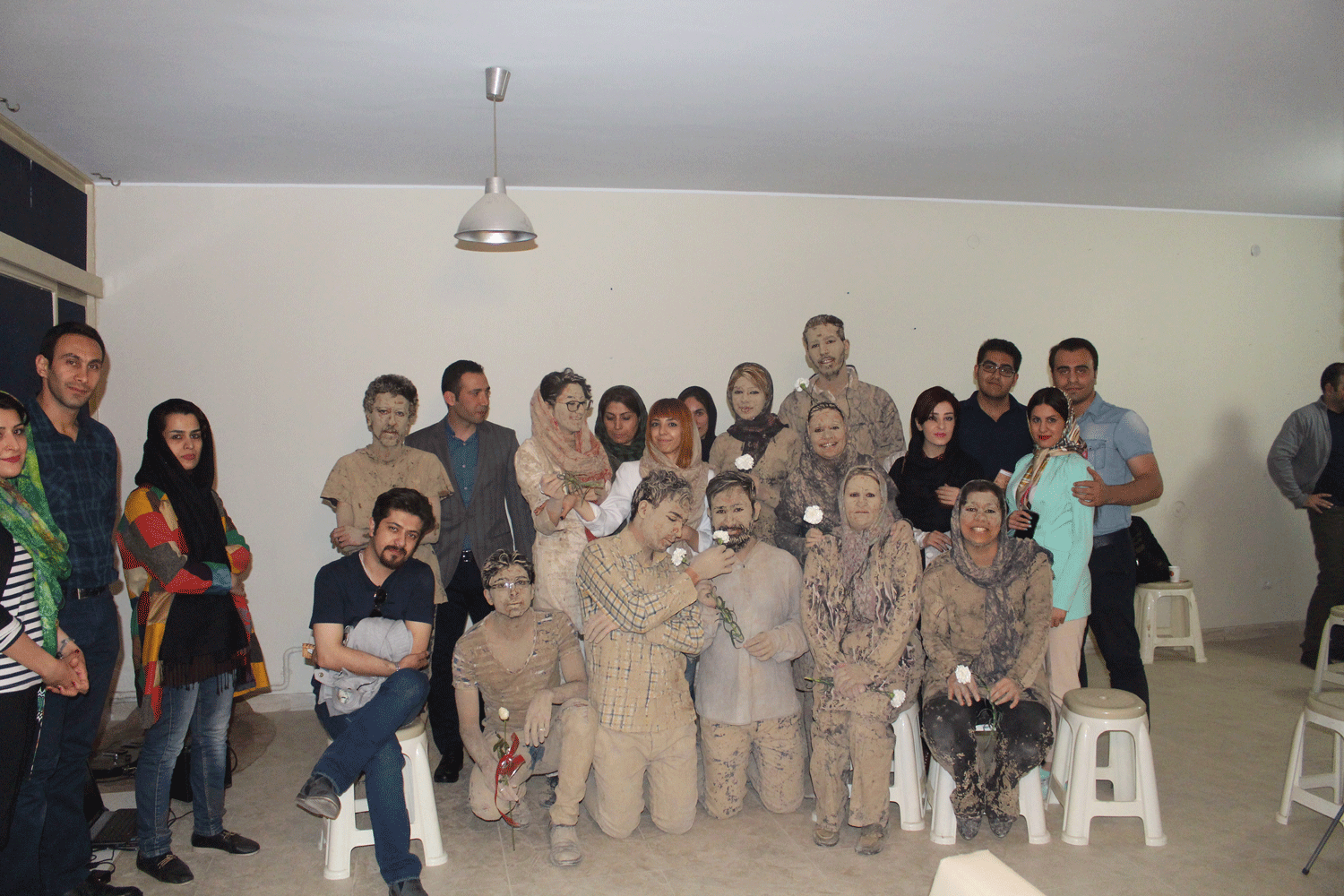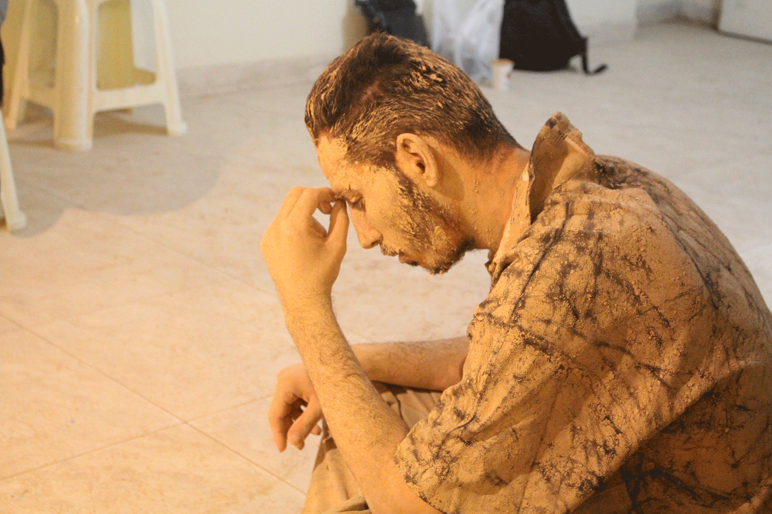هفت نفر به تعداد هفت روز هفته همه گل اندود شده ( به نشانه ی آنکه اینها انقدر بی اعتنا و بی توجه بودند که سراسر وجودشان خاکی شده حتی قلب و روحشان هم از خاک است!) چیدمان شده اند و هر کس به شکلی درخواست کمک دارد اما توجهی به او نمی شود تا اینکه می میرد.