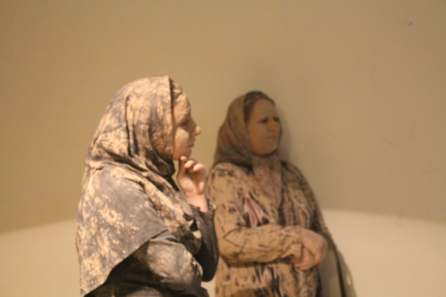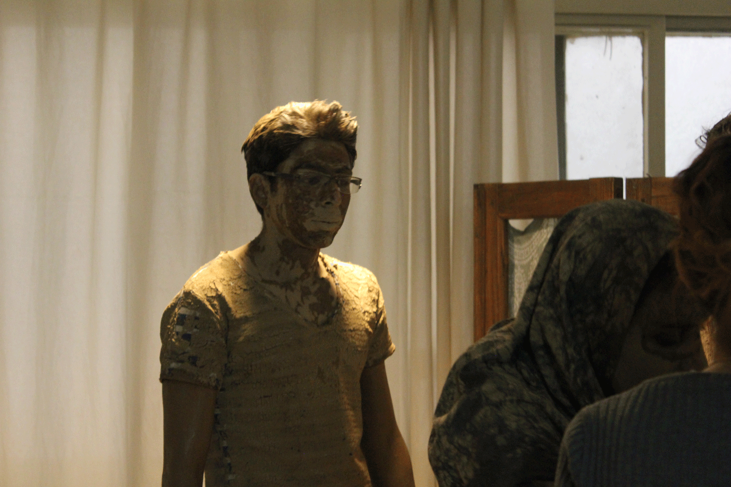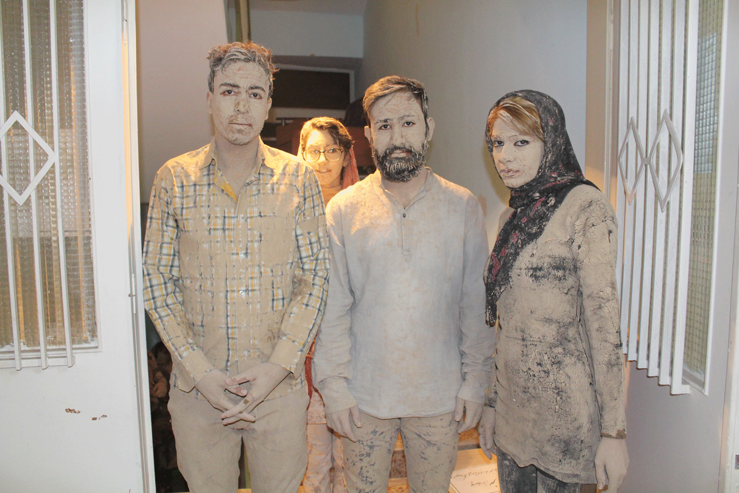 دو نفر گل اندود شده در آستانه ی در می ایستند به طوری که هر کس با ورود یا خروج خود کمی خاکی شود( به نشانه آ نکه ما هر لحظه در حال برخورد به یکدیگر هستیم بی آنکه واقعا بفهمیم که چه اثری بر دیگران می گذاریم و چه اثری دیگران بر ما می گذارند)