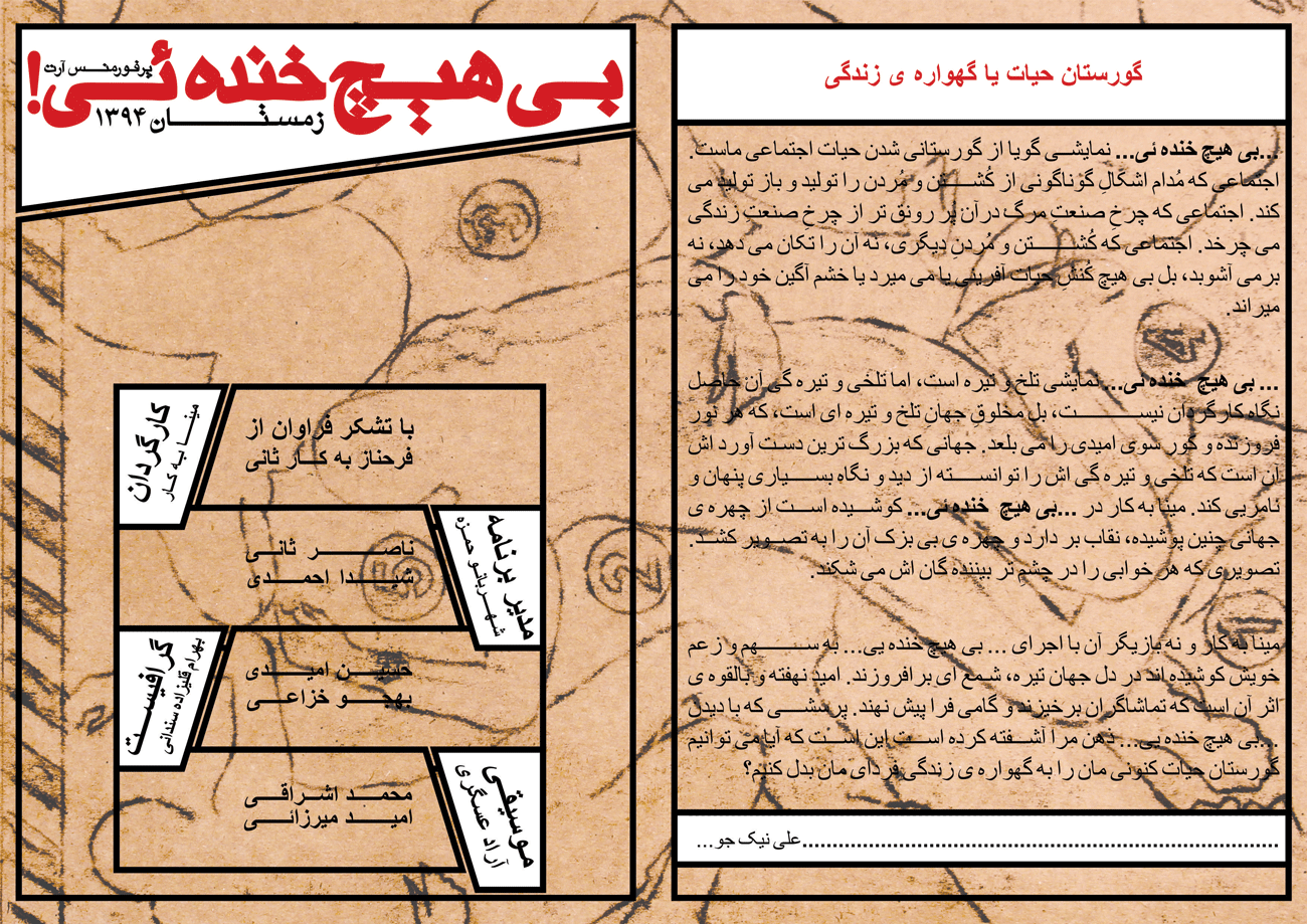 … بی هیچ… پرفورمنسی است که به کارگردانی مینا بهکار ثانی با بازی هفت بازیگر در تاریخ … در… اجرا شد. …بی هیچ… نمایشی گویا از گورستانی شدن حیات اجتماعی ماست. اجتماعی که مُدام اشکالِ گوناگونی از کُشتن و مُردن را تولید و باز تولید می کند. اجتماعی که چرخِ صنعتِ مرگﹾ درآنﹾ پُر رونق تر از چرخِ صنعتِ زندگی می چرخد. اجتماعی که کُشتن و مُردنِ دیگری، نه آن را تکان می دهد، نه برمی آشوبد، بل بی هیچ کُنشِ حیات آفرینی یا می میرد یا خشم آگین خود را می میراند.